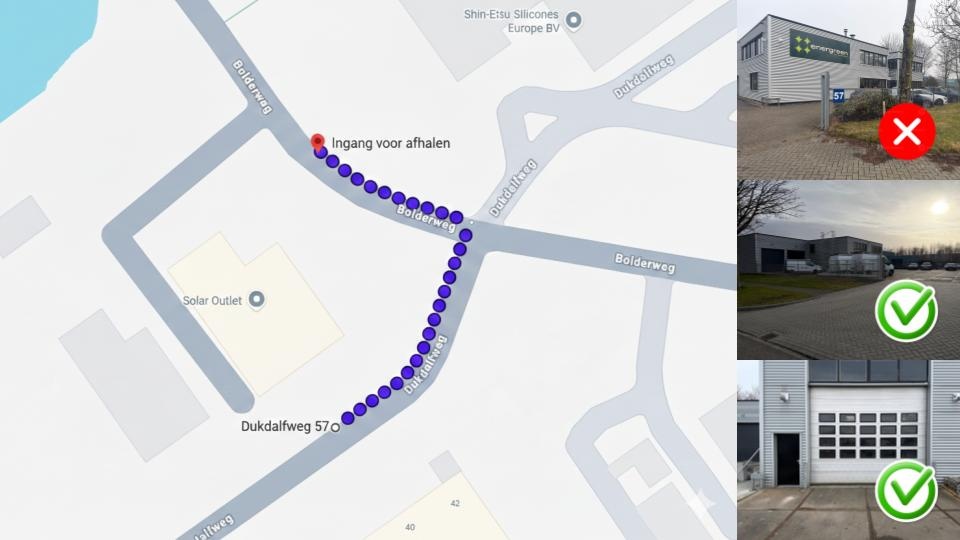 Let op: Navigatie-instructie Google Maps stuurt je naar de Dukdalfweg 57, maar stop daar niet. Rij de hoek om naar onze officiële afhaal-ingang aan de Bolderweg. Bel daar aan bij de deurbel van Solar Outlet (zie de afbeelding hieronder). We komen dan zo snel mogelijk naar buiten om je te helpen met het inladen van je bestelling!